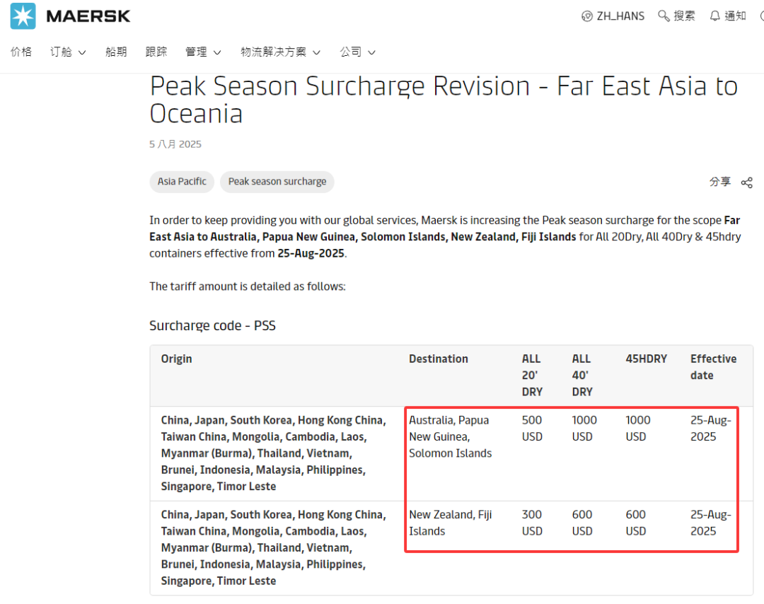 马士基表示,为了继续为您提供全球服务,马士基将从2025年8月25日起,提高征收远东亚洲至澳大利亚,巴布亚新几内亚,所罗门群岛,新西兰,斐济群岛的所有20英尺、40英尺干箱、45英尺高箱的旺季附加费PSS。